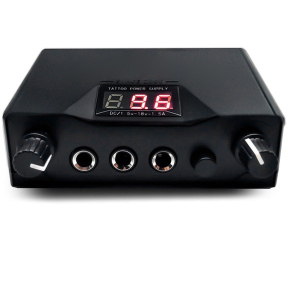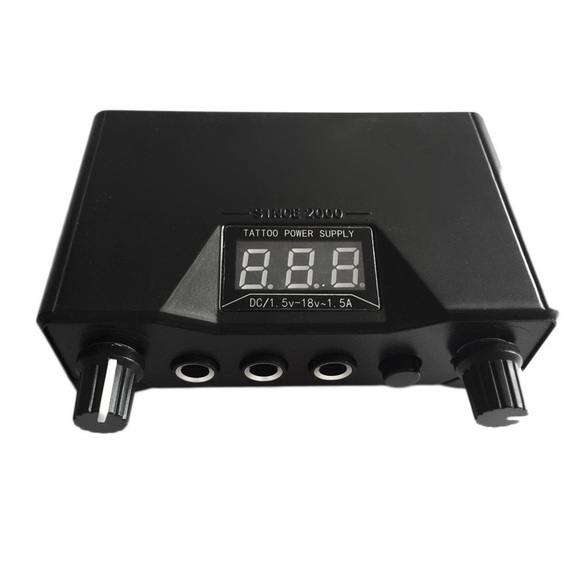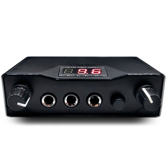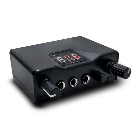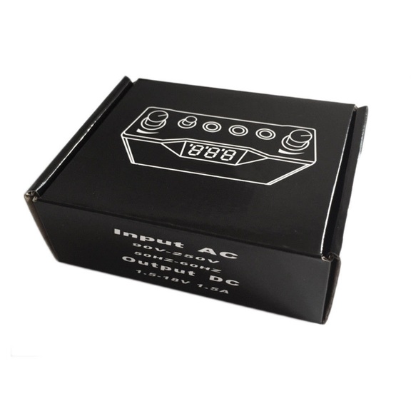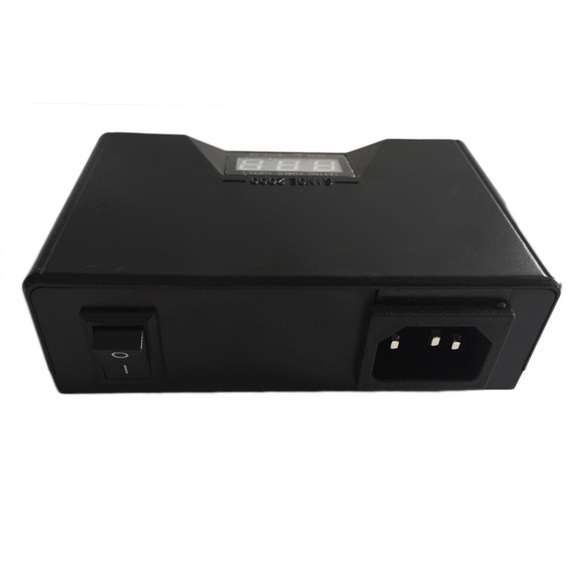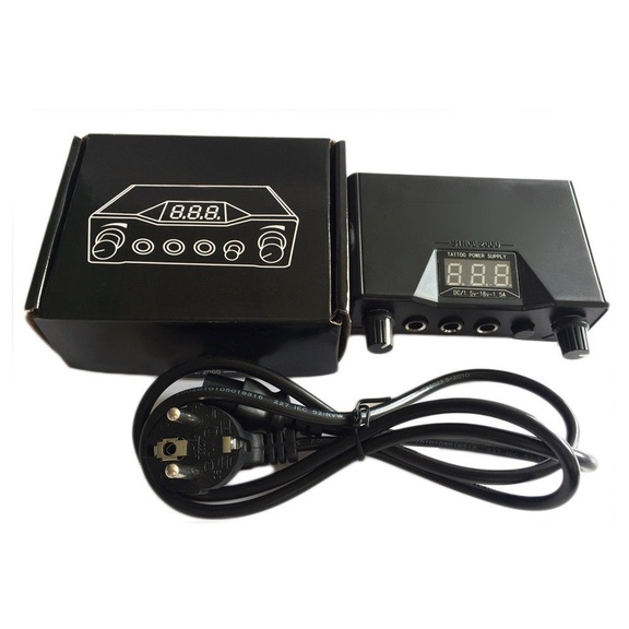 Портативно захранване за машина за татуировки за работа с 2 машини + кабел. Цифров дисплей. Размер: 11 - 7.5 - 3.5 сантиметра. Тегло: 110 грама.